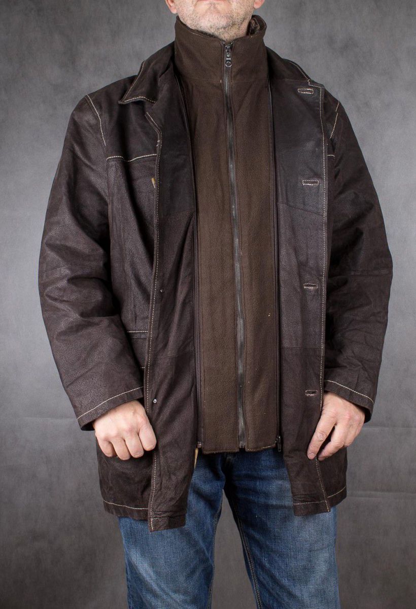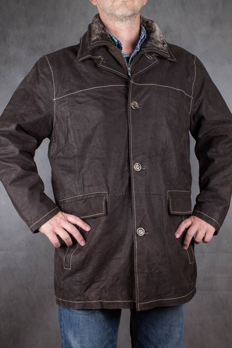 Мужская куртка из натуральной кожи коричневого цвета. Классическая прямая модель под пиджак. На молнии и пуговицах. Воротник отстегивается. Сезон осень. Имеются внешние и внутренние карманы. Размер 56-58