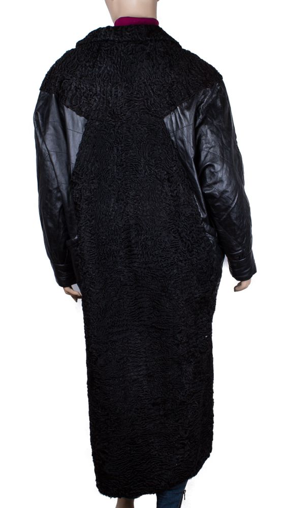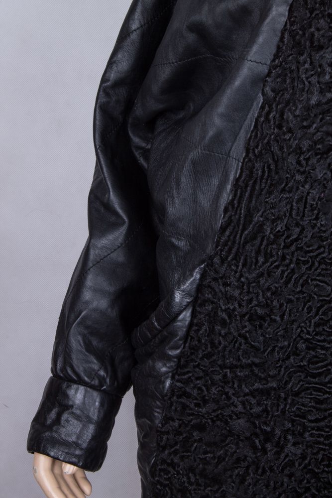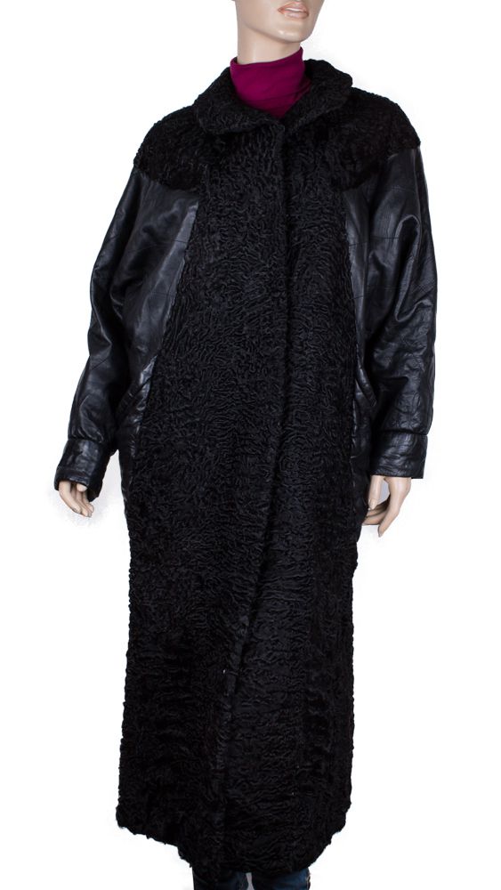 Шуба комбинированная: каракуль\натуральная кожа (рукав на синтепоне). За счёт рукава реглан подходит на пышные формы, низ заужен. Воротник : английский, отложной (крючок для глухой застёжки требует замены). Размер определен условно, лучше ориентироваться по замерам. (Обращаем внимание что объем груди замеряется в области подмышек СНАРУЖИ изделия.